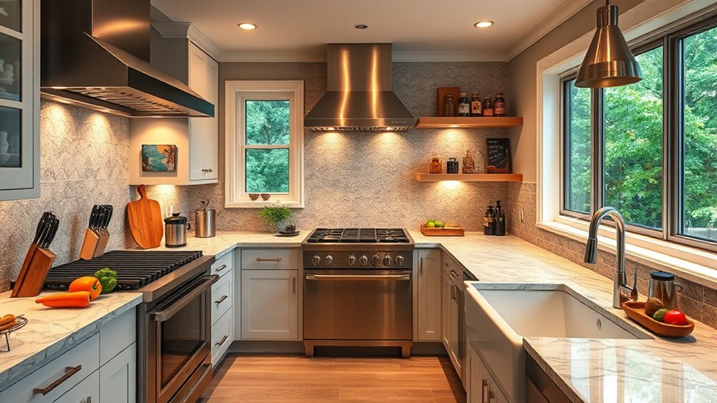 Choosing durable surfaces and ergonomic workstations is essential for creating an efficient and comfortable kitchen. Your countertop materials should withstand daily wear and tear while providing a smooth working surface. An ergonomic design ensures your workspace reduces strain and increases productivity. Select countertops like quartz or granite for durability and easy maintenance. Organize your tools and ingredients within reach, minimizing unnecessary movement. Proper height adjustments and well-placed equipment enhance comfort and efficiency. Here’s a quick overview: