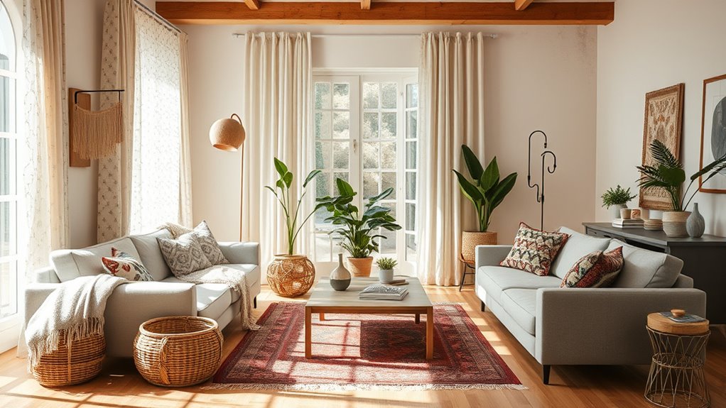 To shift from a bohemian to a curated style, focus on editing with intention. Be deliberate in your choices by asking if each item adds value or distracts from your overall vision. Reduce clutter and prioritize purpose over abundance, creating clarity and coherence. Trust your judgment to remove what doesn’t serve your authentic expression. If you adopt this mindful approach, you’ll craft spaces that reflect style and purpose—discover the details that make this shift just right.