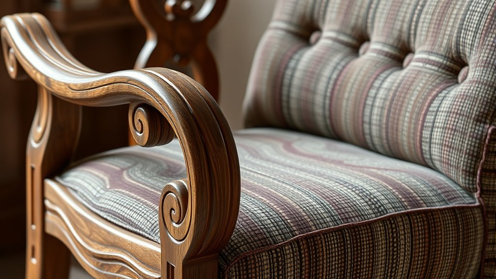 You blend classic forms with contemporary materials by choosing timeless silhouettes and updating them with sleek, modern textures. Opt for a traditional armchair in plush velvet or leather, then pair it with metal accents or acrylic legs for a fresh look. Mix natural woods with glossy finishes, or incorporate textured fabrics like boucle or faux fur. This contrast highlights craftsmanship while embracing innovation, creating a balanced, sophisticated space that feels both familiar and exciting.