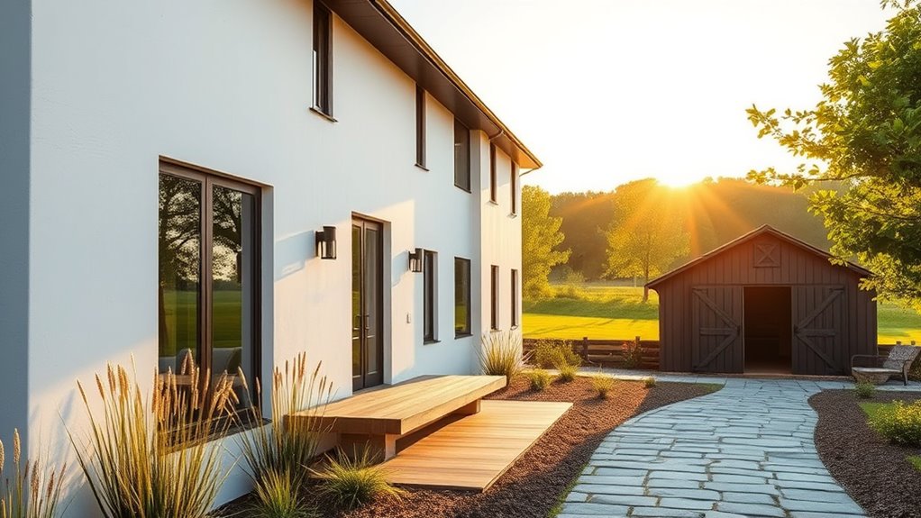 You should consider using reclaimed wood, which adds warmth and character while being eco-friendly. Incorporate bamboo flooring for its sustainability and durability, and opt for recycled metal accents to enhance modern elegance. Linens made from organic cotton or linen bring a refined touch, while low-VOC paints maintain a healthy environment. These materials blend sophistication with sustainability, creating a refined farmhouse that’s both stylish and eco-conscious.