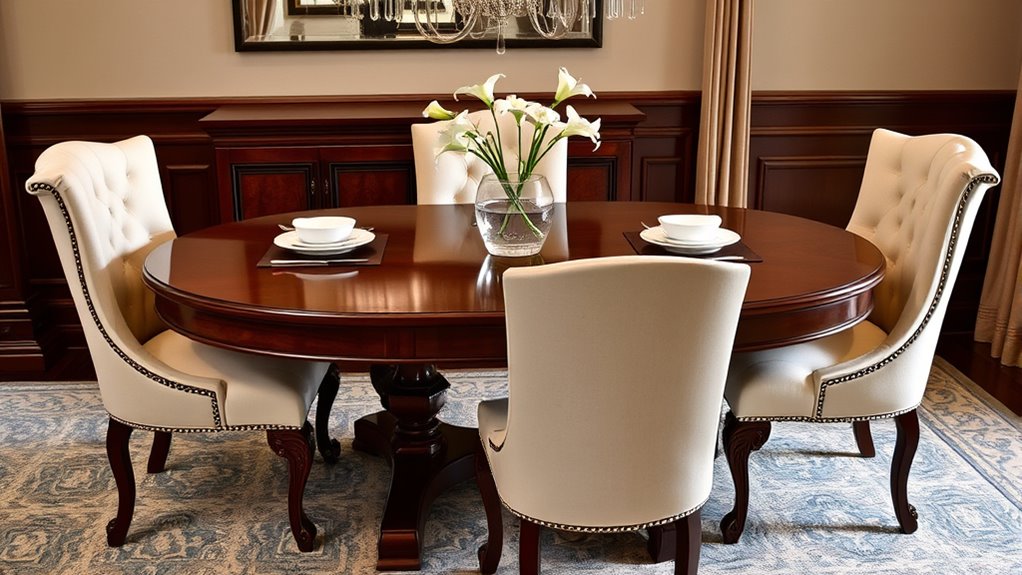 Selecting comfortable and functional chairs is essential to creating a dining space where guests and family feel at ease. Prioritize chairs that offer ergonomic support to prevent discomfort during long meals or conversations. Look for designs that support good posture, especially if you entertain frequently. Fabric options also play a crucial role; choose materials that are durable, easy to clean, and match your style. Upholstered seats provide added comfort, while leather or faux leather can give a sleek, sophisticated look. Consider adjustable features or padded cushions for extra comfort. Ultimately, your goal is to find chairs that blend comfort with practicality, ensuring everyone can enjoy meals without discomfort. Well-chosen chairs enhance your dining experience and make your space welcoming and functional. Understanding comfort in furniture design can help you select pieces that promote both relaxation and style.