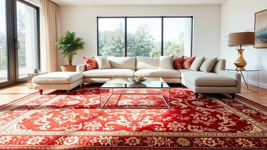 Ever wondered how to make your living room look cohesive and stylish? Achieving the right style and color coordination starts with understanding color harmony. Choose a rug that complements your existing color palette, whether through matching tones or creating pleasing contrasts. To maintain style consistency, pick a rug that echoes your room’s decor theme—modern, traditional, or eclectic. If your furniture features bold patterns, opt for a rug with subtle colors to balance the look. Conversely, if your furniture is neutral, add a pop of color with a vibrant rug. Remember, the goal is harmony—avoid clashing styles or colors that disrupt the flow. With thoughtful selection, your rug will seamlessly unify your living room’s aesthetic.
