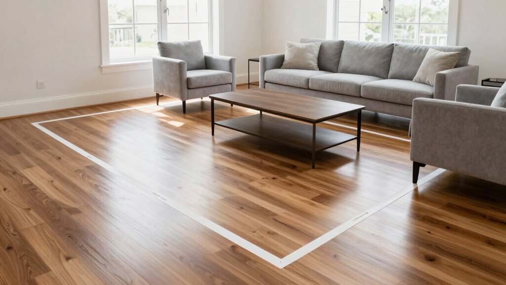Using tape outlines helps you map traffic patterns across your space, revealing how people will move. It’s also an effective way to test furniture placement before committing to any permanent changes. This simple step guarantees your layout promotes smooth flow and peak functionality.