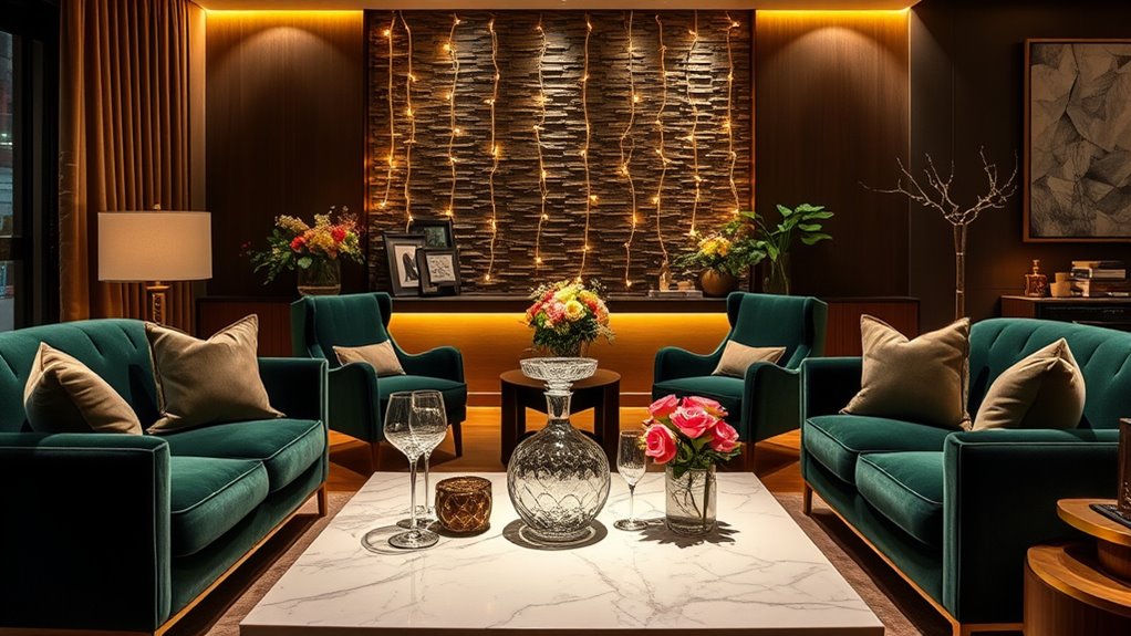 Lighting plays a key role in setting the mood and highlighting your seating arrangements, turning an ordinary gathering into an inviting space. Use warm, adjustable lighting to create cozy focal points and enhance your color schemes. Incorporate layered lighting—like table lamps, fairy lights, and dimmable fixtures—to evoke intimacy and comfort. Acoustic treatments, such as soft curtains or plush rugs, work with lighting to soften echoes and deepen the ambiance. Consider this emotional impact: | Mood | Effect | |——–|—————————————————–| | Cozy | Warm light, rich colors, soft furnishings | | Elegant | Dimmable fixtures, subtle accent lighting | | Inviting | Balanced lighting, inviting textures | Employing layered lighting techniques can significantly elevate your entertaining space by creating a dynamic and welcoming environment.
