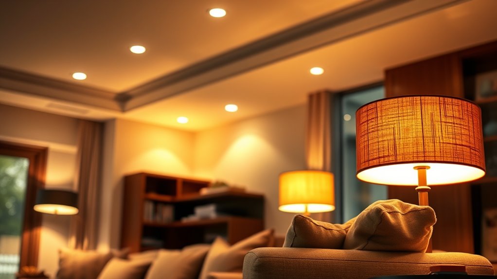 This setup allows you to easily adjust lighting based on your needs, whether cozy movie nights or focused work sessions. Balancing ambient glow with task ambiance ensures your home feels inviting yet functional, giving you flexibility and control over your lighting atmosphere.