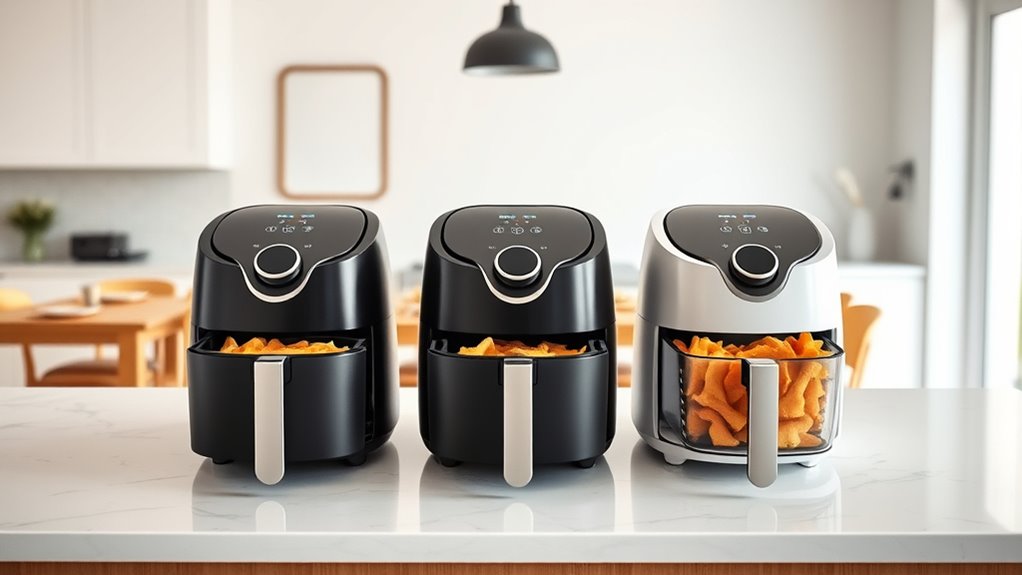Imagine a fortress protecting your family’s meal—large air fryers are equipped with safety features like automatic shut-off and cool-touch exteriors. These safeguards prevent overheating and accidental burns, giving me peace of mind when cooking for my big family. Many models also have child lock functions, ensuring curious little hands can’t access hot surfaces. It’s like having a vigilant guardian in your kitchen, making me feel secure while preparing delicious meals.