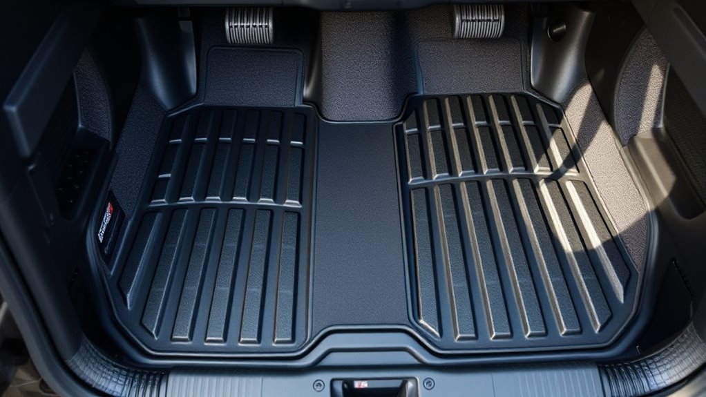 When it comes to maintaining a clean SUV interior, ease of cleaning is a key factor to contemplate in all-weather floor mats. I look for mats with smooth surfaces or deep ridges that trap dirt and debris, making cleanup quick and simple. Materials like rubber or thermoplastic elastomers are my top choice because they can be rinsed, wiped, or hosed off easily, removing mud, dirt, and stains without fuss. Trimmable mats with cut lines help me achieve a perfect fit, reducing gaps where dirt can hide. High-quality mats that are odorless and stain-resistant also cut down on harsh cleaning products and lingering smells. Plus, lightweight and flexible designs make removal and reinstallation effortless, encouraging regular maintenance and extending the life of the mats.