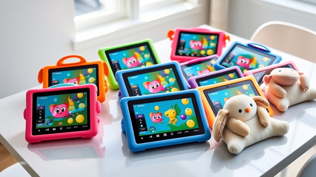 Choosing the right Amazon Fire Kids Tablet means paying close attention to age-appropriate features that match your child’s developmental stage. These features ensure the content, controls, and interface are suitable for their age, making the device both engaging and safe. For younger children, durable hardware and simple navigation are essential, while older kids benefit from more advanced educational and entertainment options. Curated content helps promote learning and safe browsing, aligned with their interests. Additionally, customizable parental controls allow you to set limits on screen time and filter content as your child grows. Accessibility features like voice commands and visual adjustments support children with different needs, guaranteeing everyone can enjoy the tablet comfortably and confidently.