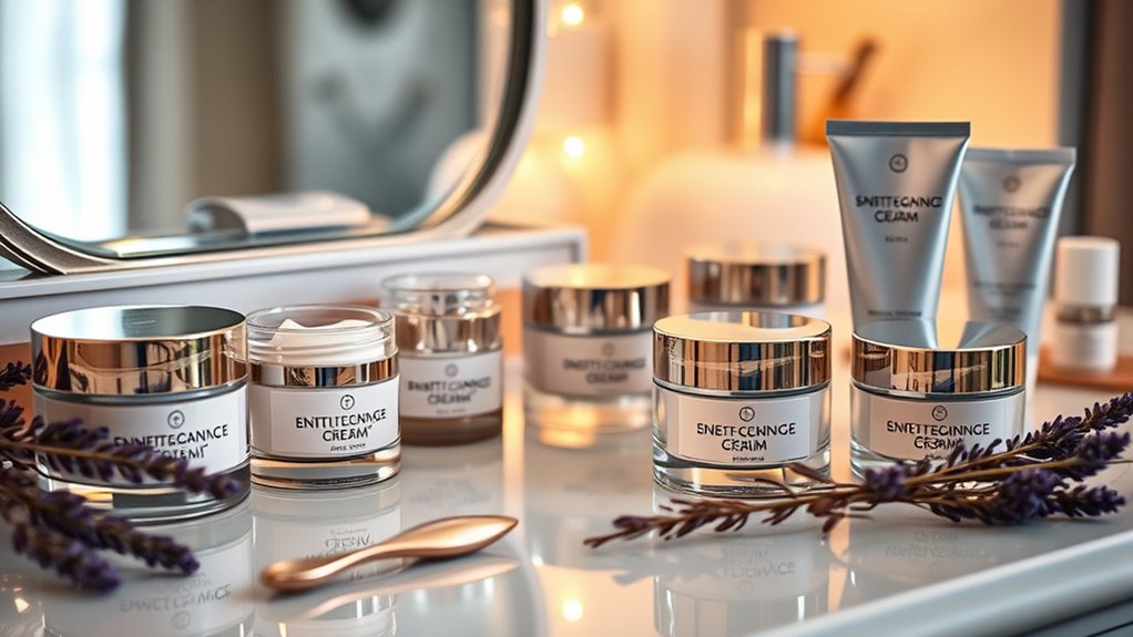 Choosing the right packaging for your anti-aging night cream directly impacts its effectiveness and shelf life. Airtight jars or tubes prevent air exposure, reducing oxidation that can break down active ingredients like retinol and peptides. Opaque or UV-protective containers shield sensitive components from light, maintaining potency over time. Seal integrity, such as tamper-evident or vacuum-sealed packaging, guarantees the product remains uncontaminated before use. Some advanced containers feature controlled-release technology, like MVE, which gradually delivers ingredients, boosting efficacy and reducing irritation. Even reusable or recyclable containers must keep an airtight seal to preserve the formula’s effectiveness. Thoughtful packaging choices help maximize your night cream’s benefits, ensuring it stays potent and safe for consistent use.