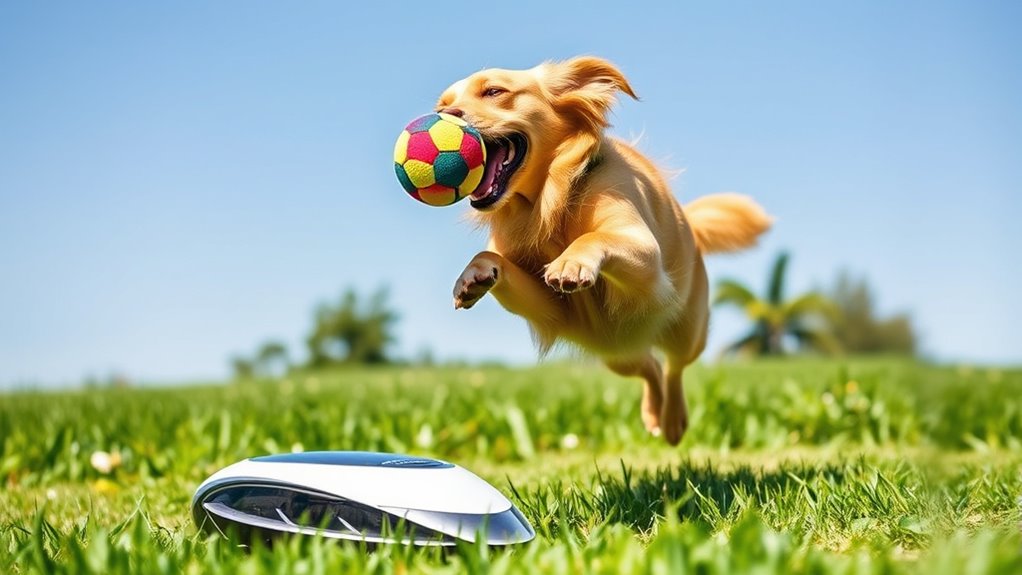 Safety features are crucial to guarantee that playtime remains fun and risk-free for both dogs and their owners. Many automatic ball launchers include obstacle detection sensors that stop or adjust the launch to prevent injuries or accidents. These sensors help ensure that your dog isn’t hit or startled by an unexpected launch. Safety alerts or warning sounds are also common, notifying pets and owners before a ball is shot, reducing surprise reactions. Some devices incorporate motion sensors to confirm that no pets or people are in the firing zone, further minimizing risks. Adjustable launch distances and modes allow you to customize play according to your dog’s size and energy level, enhancing safety. Proper maintenance, like keeping balls dry and clean, is essential for these safety features to function correctly and prevent malfunctions.