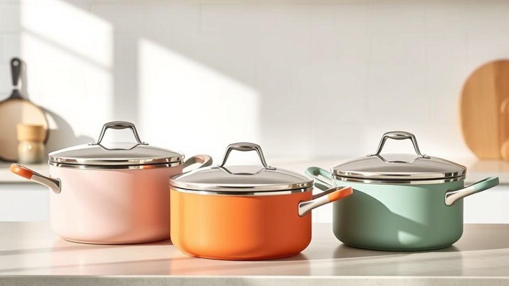 Based on expert reviews, the top three Caraway cookware sets for 2025 include the versatile Caraway Cookware+ Collection, the compact Nonstick Ceramic Frying Pan, and the durable 12-Piece Stainless Steel Set. Each offers non-toxic, eco-friendly materials and excellent heat distribution, fitting a variety of cooking needs. Whether you’re looking for everyday essentials or a all-inclusive set, these options combine safety, style, and value. Keep exploring, and you’ll find out which set suits your kitchen best.