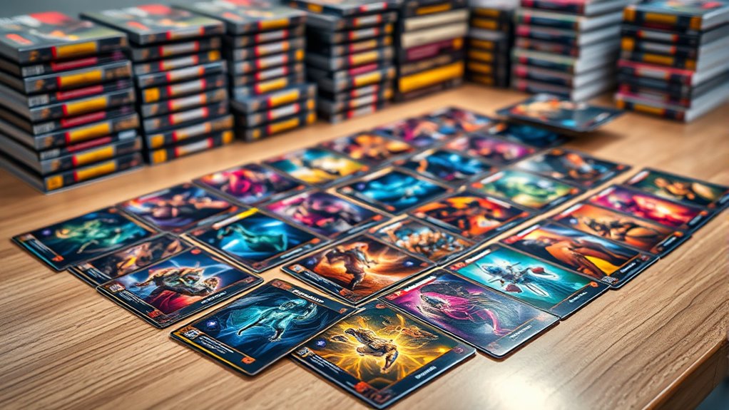 Price and accessibility are key factors that can make or break your experience with collectible trading card games. The cost of booster packs varies from $3 to $10, influencing how easily you can expand your collection without breaking the bank. Accessibility depends on where you shop—online stores, hobby shops, or big-box retailers—making it easier or harder to find specific cards. Limited edition or rare cards tend to be pricier and harder to locate, which can add to the challenge. Luckily, many games offer starter decks or bundle packs that provide good value and simplify entry for newcomers. Digital versions and online platforms further improve accessibility, allowing you to build decks and trade cards without physical constraints. Balancing cost and availability is essential for a fulfilling collecting experience.