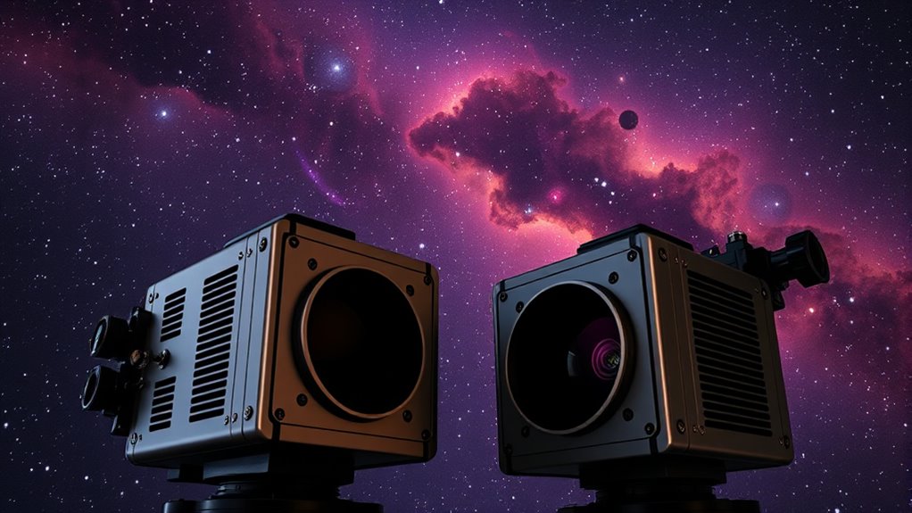 Cooled CMOS astro cameras leverage thermoelectric cooling (TEC) to effectively lower sensor temperatures, which plays a essential role in reducing thermal noise during long exposures. By decreasing the sensor temperature, dark current—one of the main sources of noise—is markedly minimized, resulting in clearer images. This cooling allows for longer exposures without the buildup of hot pixels or grainy artifacts, fundamental for capturing faint deep sky objects. The effectiveness of noise reduction depends on the cooling capacity, measured in degrees Celsius below ambient, with more robust cooling providing cleaner images. Additionally, proper calibration techniques like dark frame subtraction help further diminish residual noise, ensuring the final astrophotos are sharp and detailed. Overall, efficient cooling is indispensable for achieving high-quality, noise-free deep sky images.