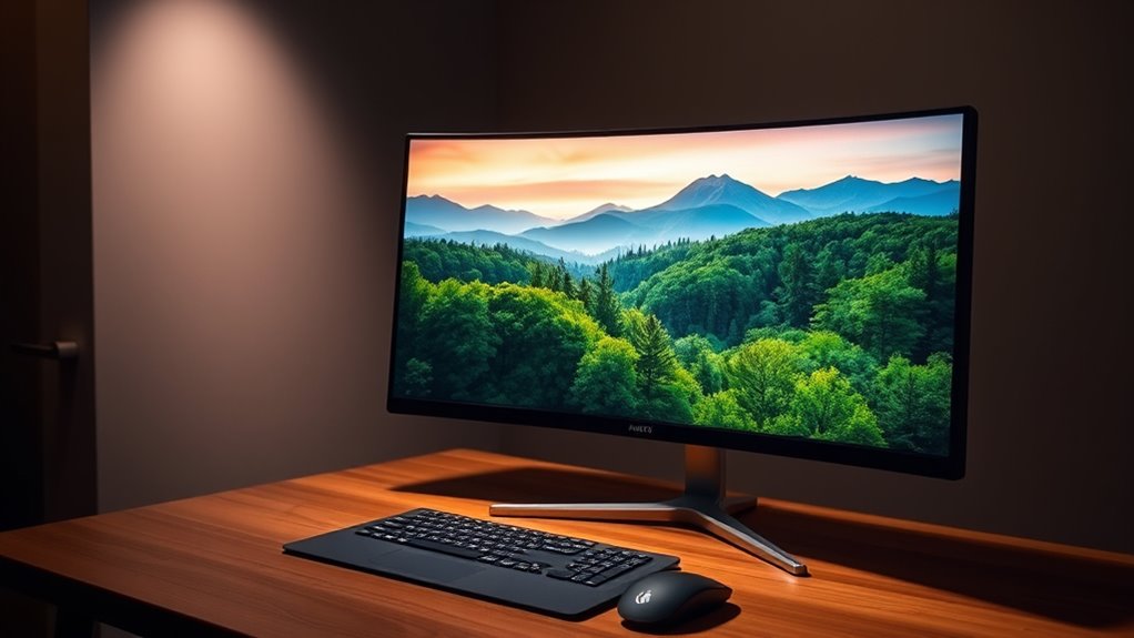 Higher display resolutions like 1440p or 4K substantially enhance the sharpness and detail of images, making your immersive viewing experience more vivid and engaging. With these resolutions, textures appear crisper, and colors pop, pulling you deeper into the action. While Full HD (1080p) is common on mid-range curved monitors, it can look less sharp on larger screens, reducing immersion. Ultra-wide resolutions like WQHD or UWQHD boost multitasking and panoramic views, intensifying the curved screen’s immersive effect. Pixel density, or pixels per inch, also plays a pivotal role—higher density means crisper visuals, especially on bigger displays. Finally, make certain your hardware can handle the resolution smoothly, so you don’t sacrifice performance or image quality during extended use.