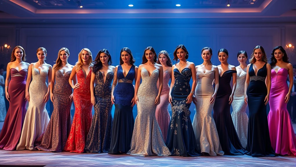 Looking for the perfect gown to shine at any event? I recommend exploring stylish options like one-shoulder jacquard, chic A-line dresses, sequin v-necks, and elegant mermaid styles. Fabrics such as satin, tulle, and beaded details elevate their luxury, making you stand out. Fit and length adjustments guarantee a flawless look. If you want details on the top 15 designer evening gowns, keep going — you’ll find styles that suit any occasion.