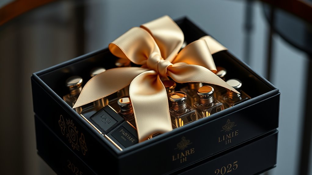 When selecting a designer fragrance gift box, the presentation plays a essential role in making the gift feel special and luxurious. I look for high-quality materials like ornate boxes, decorative ribbons, and premium finishes that create a lavish unboxing experience, reflecting the fragrance’s prestige. Artistic design elements, such as floral motifs, metallic accents, or thematic illustrations, help the gift stand out and add visual appeal. Ensuring the packaging is secure is crucial to avoid damage during transit and keep the gift pristine. I also consider thoughtful details like personalized messages, elegant gift tags, or wrapping, which add a memorable touch. A well-crafted presentation not only enhances the overall gift but also elevates the recipient’s experience, making it truly unforgettable.