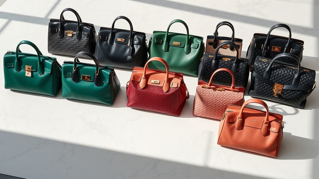 Selecting the right designer handbag involves carefully considering its size and capacity to make certain it fits your daily essentials comfortably. You want a bag that’s large enough to hold your wallet, phone, keys, and makeup but not so bulky that it becomes cumbersome. Pay attention to the number of compartments and pockets to help keep your items organized and easily accessible. Check the overall dimensions—height, width, and depth—to ensure it suits your body frame and carrying style. Larger bags offer more storage but tend to be heavier and less formal, while smaller ones are lightweight and stylish. Also, consider the internal layout, such as zippered pockets or separate sections, which enhance usability and security.