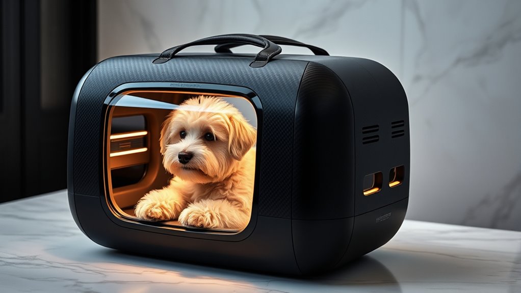 Designer pet carriers guarantee proper ventilation through strategically placed mesh panels and breathable materials that allow airflow. I love how they combine style with functionality, so my pet stays comfortable and cool. These carriers often feature adjustable vents or windows that I can open or close, giving me control over airflow. It’s reassuring to know my pet gets fresh air, no matter where I take them, without sacrificing style.