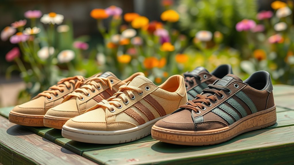 Choosing eco-friendly sneakers involves carefully examining the materials used, as these play a crucial role in minimizing environmental impact. Recycled plastics, organic cotton, hemp, cork, and plant-based textiles are common choices that help reduce waste and reliance on non-renewable resources. Many brands incorporate biodegradable or compostable components, ensuring the shoes break down more easily after disposal. Using renewable and responsibly sourced materials also lowers the overall carbon footprint of production. Innovations focus on reducing water and chemical use, making manufacturing more eco-conscious. To verify sustainability claims, look for certifications like GOTS, OEKO-TEX, or B Corp, which indicate strict adherence to environmental and social standards. Prioritizing these materials helps you choose sneakers that are both stylish and kinder to the planet.