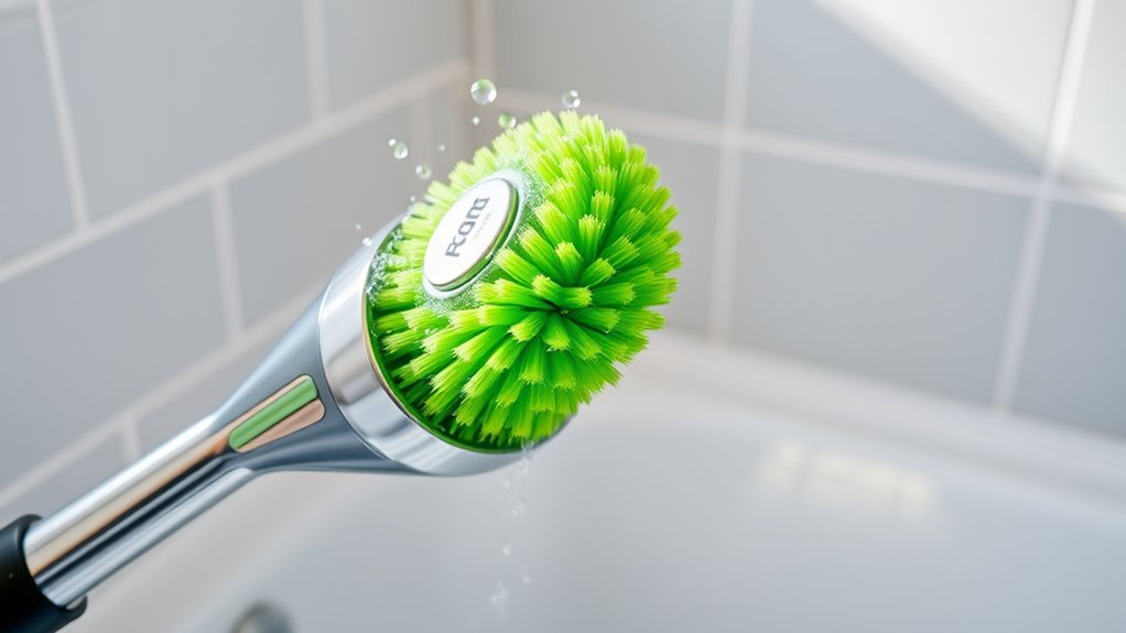 Choosing an electric spin scrubber that’s easy to use hinges on several key features. An ergonomic handle and adjustable length help reduce physical strain, making cleaning more comfortable. A lightweight design, usually under 3 pounds, allows for easy maneuvering and less fatigue during extended use. Intuitive controls like one-touch switches and adjustable speed settings simplify operation, especially for beginners. Cordless models offer greater freedom of movement, removing the hassle of tangled cords or limited reach. Additionally, clear digital displays indicating battery life and mode help me operate the scrubber efficiently, avoiding surprises or interruptions. Overall, these features ensure that using the scrubber is straightforward and less tiring, so I can focus on getting my cleaning tasks done quickly and effectively.