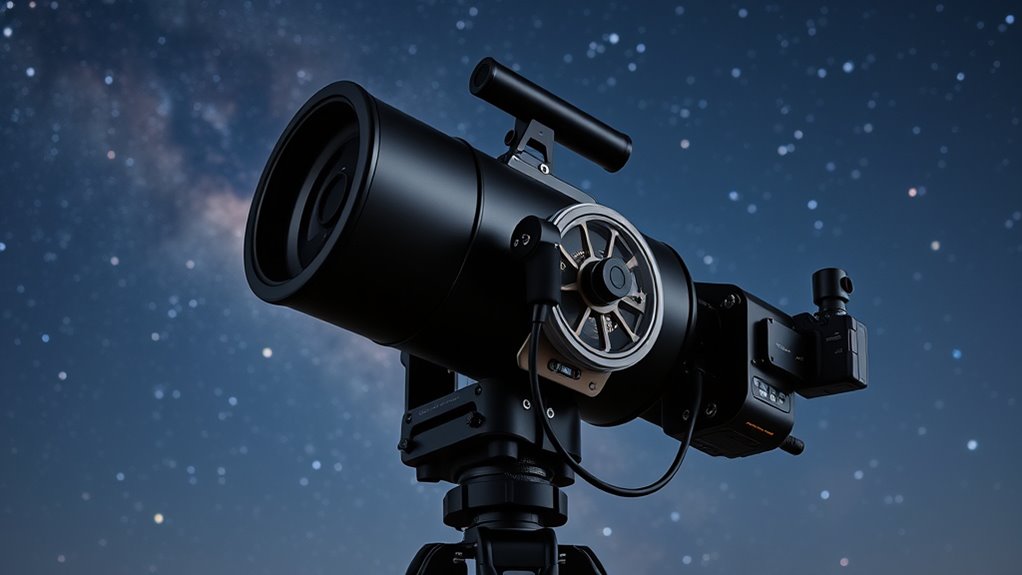 Belt drive systems are undeniably quieter than traditional gear drives, and I’d say they’re practically whispering secrets to the night sky. The absence of metal-on-metal contact reduces noise markedly, making your astrophotography sessions more peaceful and enjoyable. With belt drives, I’ve noticed a smoother, more silent operation that lets me focus on capturing stellar images without the distracting clatter of gears. It’s like astronomy’s equivalent of a calming lullaby.