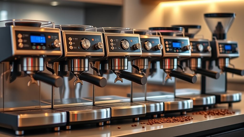 Choosing the right espresso machine with a built-in grinder starts with understanding your available space. Measure your countertop to guarantee the machine fits comfortably without overcrowding. Look at its dimensions—height, width, and depth—and compare them with your designated area. If space is tight, opt for a compact model; just keep in mind that smaller units might have fewer features or less capacity. Also, consider how easily you can access water refills, load beans, and perform maintenance tasks without obstruction. Larger machines often come with more features but require dedicated space and may not suit small kitchens or tight spaces. Prioritizing size and fit assures your espresso setup is convenient and clutter-free, making your coffee routine more enjoyable.