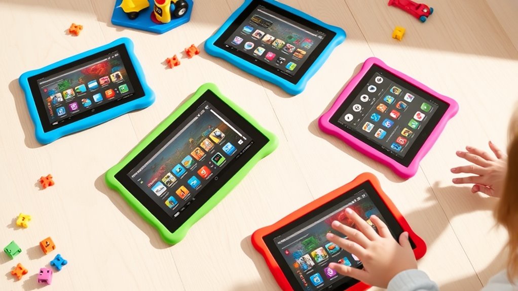 If you’re looking for the best Fire HD tablets for kids that perfectly blend fun and durability, I’ve got you covered. From the vibrant Fire HD 10 Kids Pro to the compact Fire HD 8 models, these tablets come with sturdy kid-proof cases, long battery life, and engaging parental controls. They support a wide range of content with expandable storage and include age-appropriate features. Keep going, and you’ll discover more ways to choose the ideal device for your child.