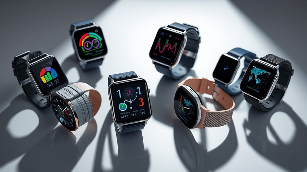 A fitness tracker watch that feels comfortable to wear makes a big difference in how often you’ll actually use it. I look for adjustable straps made from breathable, lightweight materials like silicone or elastomer, so I can wear it all day without irritation. The device’s weight should be under 50 grams to prevent fatigue during long workouts or daily wear. An ergonomic design with rounded edges and a snug fit helps prevent slipping or chafing, even when I sweat. I also consider the size of the display and overall watch dimensions to match my wrist size comfortably. Proper weight distribution and balanced design are key, especially if I have sensitive skin or plan to wear it for extended periods. Comfort truly makes or breaks my experience.