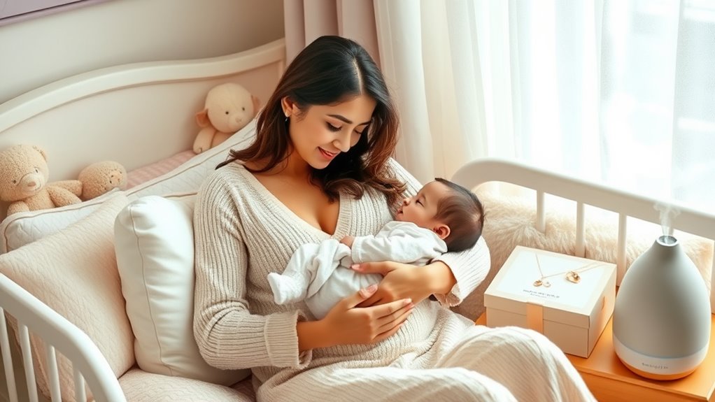 Choosing the right gift for a new mom means considering the occasion to guarantee it’s appropriate and meaningful. Whether it’s a baby shower, her first Mother’s Day, or a postpartum celebration, the gift should suit the event’s tone. I always think about her recovery and emotional state, selecting items that feel supportive without being overwhelming. It’s also important to match the gift to the formality of the occasion—something more special for big milestones or casual for everyday moments. I keep her lifestyle and preferences in mind, avoiding gifts that may be impractical or unwelcome. in the end, I’m mindful of cultural or personal sensitivities, ensuring my choice respects her background and feelings. Thoughtful consideration of the occasion makes any gift more meaningful and appreciated.