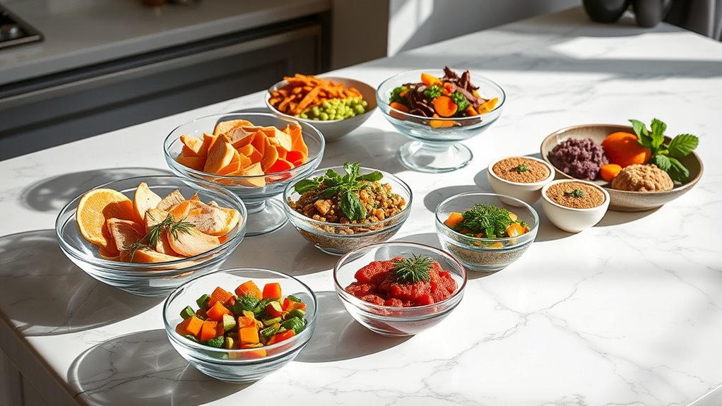 Choosing the right gourmet pet food begins with scrutinizing the quality of its ingredients. I look for brands that prioritize real meat, vegetables, and wholesome components, avoiding fillers like corn, wheat, soy, and by-products that offer little nutritional value. Transparency is vital, so I check labels carefully to see where ingredients come from and guarantee they meet strict sourcing standards. Reputable brands often display certifications or adhere to industry benchmarks, such as AAFCO compliance, confirming safety and nutritional adequacy. I also favor products with natural preservatives and no artificial flavors, colors, or preservatives, which signals higher ingredient quality. Ultimately, I want ingredients that support my pet’s health and digestion, guaranteeing their meals are both nutritious and safe.
