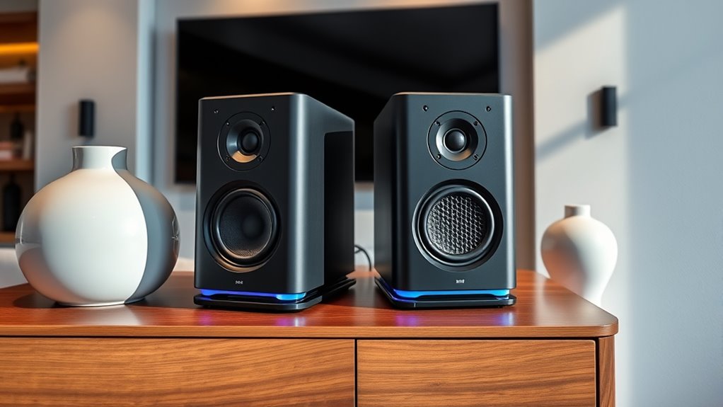 The visual appeal of hi-fi speakers plays a significant role in how well they blend into your home environment. I look for designs that complement my decor, whether modern, vintage, or minimalist. Aesthetic details like cabinet materials, finishes, and colors can elevate the room’s style while enhancing sound quality. Size and shape matter too, influencing placement and integration into the layout. Handcrafted cabinets with textured finishes, such as vintage wood, add decorative charm and help reduce resonance. Space-saving options like wall-mountable or compact speakers are excellent for maintaining an uncluttered look. Ultimately, choosing speakers that balance beauty and function ensures they complement your space without sacrificing sound performance. A well-designed pair can be both a visual centerpiece and a sonic upgrade.