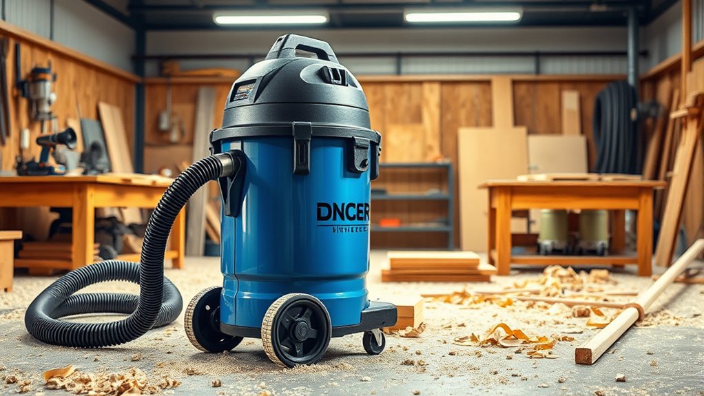 When choosing a high-CFM shop vacuum, I look for safety features like automatic shut-off to prevent overheating, sturdy construction to avoid leaks, and secure hose connections to prevent accidental disconnections. A good vacuum should also have a built-in filter indicator, so I know when to replace filters, and safety vents to prevent dust from escaping during operation. These features keep me safe and ensure my workspace stays clean and hazard-free.