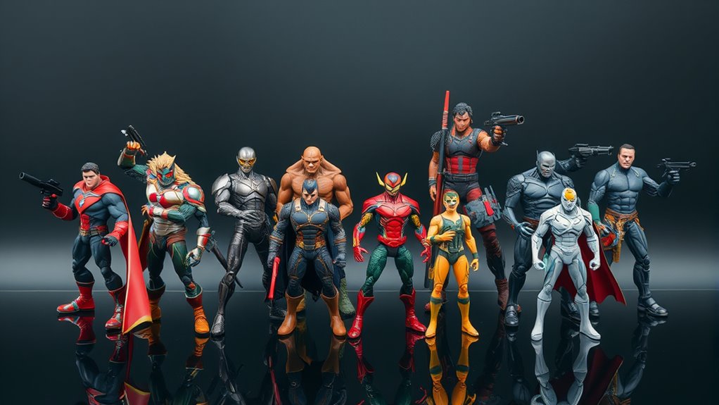 High-end action figures stand out because of their exceptional articulation and poseability, which allow for a wide range of dynamic and realistic displays. Usually, they feature over 20 joints, including ball-and-socket, hinge, and swivel joints, providing smooth movement in the arms, legs, neck, and torso. This level of articulation makes it easier to recreate iconic poses or action scenes, adding depth to your collection’s storytelling. Interchangeable hands, heads, and accessories further boost customization and poseability. Durable, well-designed joints are vital; they guarantee stability during complex poses and prevent parts from loosening or falling off over time. These features make high-end figures versatile display pieces, elevating both aesthetic appeal and playability for serious collectors.