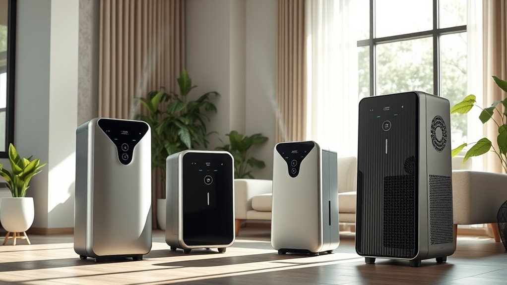 Smart control features elevate high-end air purifiers by adding convenience and precision to allergy management. Many models include Wi-Fi connectivity, allowing me to control and monitor my purifier remotely through smartphone apps. Voice control compatibility with Alexa or Google Assistant makes adjustments hands-free, perfect for busy moments. These features also provide real-time air quality data, such as PM2.5 levels, so the purifier can automatically adjust fan speeds for peak performance. Programmable timers and scheduling help me customize operation times, saving energy and ensuring consistent air quality. Additionally, smart interfaces send filter status alerts and maintenance reminders, preventing unexpected downtime. These intelligent features make high-end purifiers more user-friendly, ensuring I maintain a healthy environment effortlessly and with greater confidence.