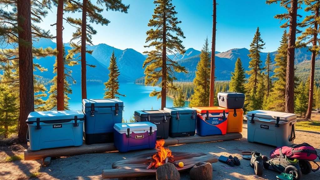 Choosing the right size cooler sets the stage for your camping experience, but it’s the additional features and accessories that truly enhance functionality and convenience in the great outdoors. Built-in cup holders and dry storage compartments make it easier to enjoy your favorite drinks and keep essentials organized. I love coolers with reinforced handles and lockable latches—they boost durability and security. Innovative insulation technologies, like FrostVault, keep ice for days! Plus, foldable shelves and organizational trays allow me to maximize space efficiently. Accessories such as shoulder straps and rugged wheels really help when I’m steering through rough terrain. With these thoughtful features, my outdoor adventures become seamless and enjoyable.