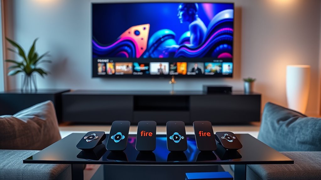 If you’re looking for the best high-end Fire TV streaming devices of 2025, I’ve found top options like the Fire TV Cube (3rd Gen), Fire TV Stick 4K Max, and various refurbished models that deliver stunning 4K HDR visuals and immersive sound with Dolby Vision and Atmos. These devices offer powerful processors, fast connectivity with Wi-Fi 6E, and advanced remote controls. Keep exploring to discover the perfect device to elevate your streaming experience.