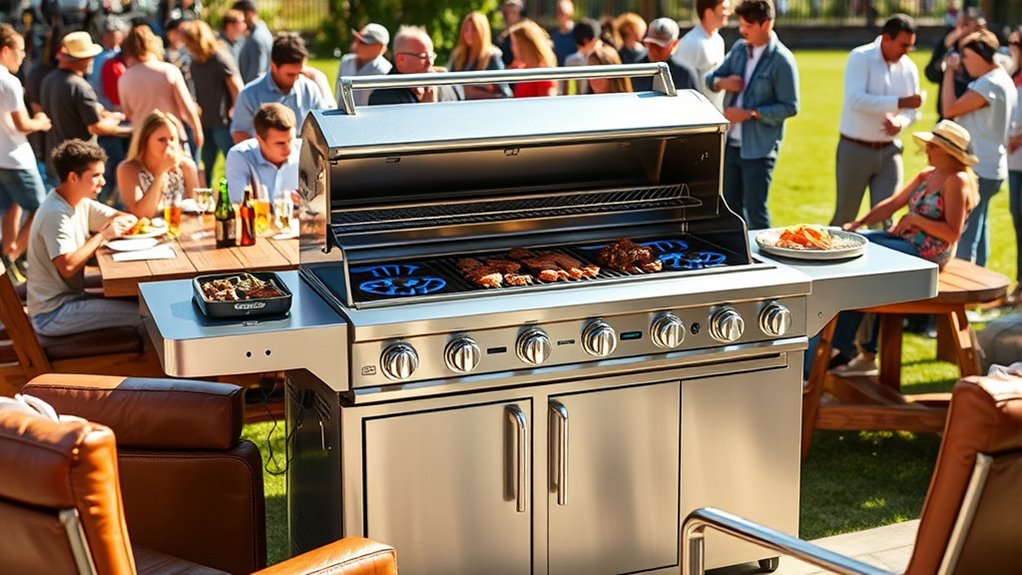 Since precise temperature control is essential for achieving perfect results, many premium grills come equipped with multiple adjustable burners that let you create distinct heat zones across the cooking surface. This flexibility allows me to cook different foods simultaneously at ideal temperatures, whether searing steaks or slow-cooking ribs. Built-in thermometers or digital monitors enable real-time heat tracking, helping me fine-tune the temperature easily. Some models even feature independent burner controls, so I can set varied temperatures on different zones without hassle. Advanced grills also incorporate electronic or push-button ignition systems, ensuring consistent flame adjustments with minimal effort. Overall, these temperature control features provide the precision needed for even cooking, reducing flare-ups and ensuring my tailgate feast is cooked to perfection every time.