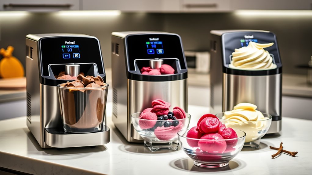 When selecting a premium ice cream maker, it’s important to contemplate the customization options it offers, as these let me tailor textures, flavors, and ingredients to my tastes. Many high-end models feature adjustable texture settings, allowing me to control hardness, creaminess, and how mix-ins are incorporated. Some machines support a variety of recipes, including dairy-free, low-sugar, and vegan options, giving me flexibility with ingredients. Adjustable timers and churn speeds help me achieve the perfect consistency. I also appreciate features like adding mix-ins—nuts, chocolate chips, or fruit—either during or after churning, often with dedicated compartments or re-spin functions. Additionally, recipe programs tailored for specific flavors or dietary needs let me experiment and personalize my frozen treats with ease.