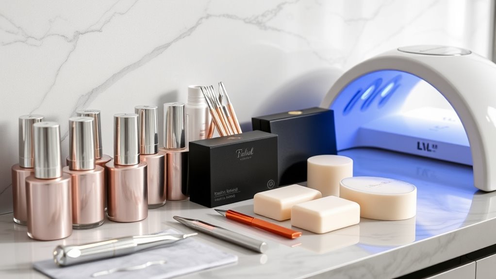 To keep your tools in top condition, I recommend cleaning them thoroughly after each use with a disinfectant or alcohol wipe. Regularly check for signs of wear or rust and replace tools as needed. Sharpen scissors and files occasionally to maintain their effectiveness. Store everything in a clean, dry place, ideally in a dedicated case, to prevent damage and contamination. Proper maintenance guarantees your tools stay sharp, hygienic, and ready for salon-quality results.