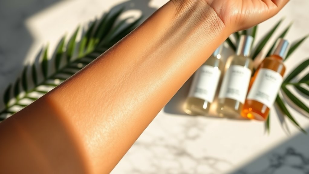 Choosing the right high-end self-tan product depends heavily on your skin type, as formulations vary to suit different needs. I always look for products with soothing ingredients like aloe vera, vitamin E, or hyaluronic acid to prevent irritation and keep my skin hydrated during the tanning process. It’s also important to take into account the product’s pH balance and ingredient purity, which influence how evenly the tan develops and help prevent patchiness. If you have sensitive or allergy-prone skin, opt for fragrance-free, hypoallergenic formulas free from harsh chemicals or dyes. Before applying full-body, I recommend testing a small patch first—this simple step helps ensure your skin responds well and reduces the risk of adverse reactions. Choosing carefully ensures a flawless, natural-looking glow.