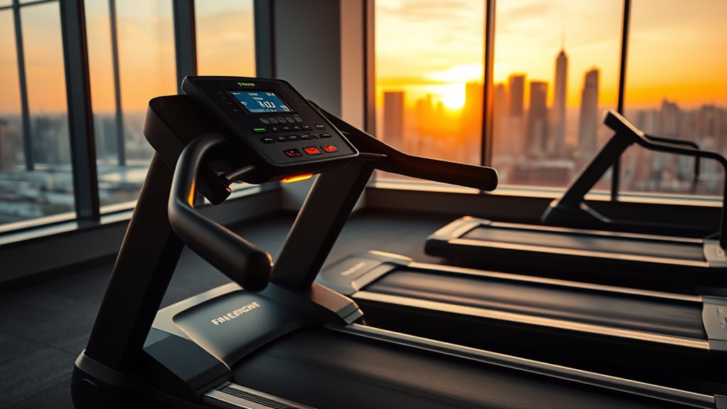 Safety and stability are essential considerations when choosing high-end treadmills with incline, especially for serious runners. I look for models with anti-slip belts and shock absorption systems to protect my joints and ensure secure footing during intense workouts. Built-in safety features like emergency stop keys and automatic shutdown functions give me peace of mind, preventing accidents if I lose control. A stable frame made from reinforced materials with a low center of gravity prevents wobbling or tipping, even at steep inclines or high speeds. Precise control of speed and incline through digital displays allows me to adjust safely and accurately. Additionally, secure handrails and stability bars provide extra support during challenging sessions, making sure I stay balanced and safe throughout my workouts.