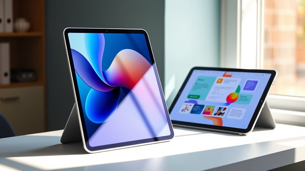 If you’re choosing between the iPad Pro 2025 and the iPad Air for students, I recommend considering your performance needs and portability. The iPad Pro offers a powerful M3 chip, larger display, and higher storage options, making it ideal for creative or demanding tasks. Meanwhile, the iPad Air is lighter, more affordable, and perfect for everyday use and portability. To find which suits you best, keep in mind your workflow — there’s more to explore ahead!.