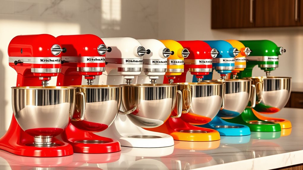 If you want to brighten up your kitchen in 2025, I suggest exploring the top KitchenAid mixer colors like vibrant reds, fresh aqua, sleek blacks, and timeless whites. Trendy shades such as Candy Apple Red or Aqua Sky Blue can add energy, while neutral tones like Stainless Steel and Matte Black offer sophistication. Choosing the right hue can reflect your style and enhance your space. Keep going to discover which colors stand out most this year.
