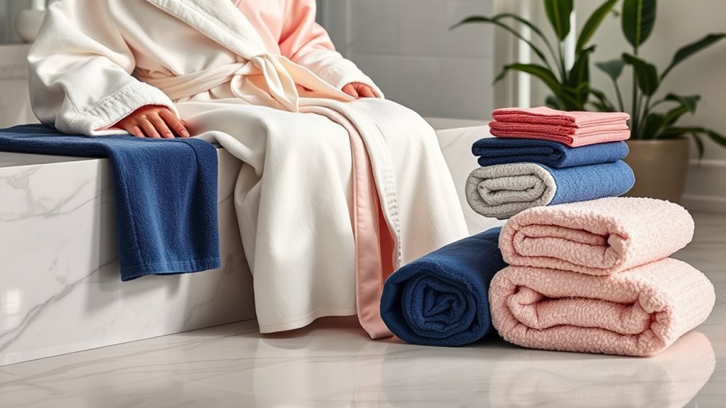 Opting for luxury bathrobes and towel sets with excellent absorbency guarantees you dry off quickly and comfortably after a shower or bath. High-quality fabrics like Turkish cotton or velour are thick and plush, boosting their moisture-wicking ability. The GSM (grams per square meter) rating is a good indicator—higher GSM, like 700, means better absorbency and faster drying. Natural fibers, especially long-staple or Turkish cotton, excel in moisture absorption and quick drying. Properly woven or looped terry cloth increases surface area, enhancing the towel’s ability to wick moisture away. To keep these luxurious textiles performing their best, avoid fabric softeners and wash regularly. Proper care ensures your towels and robes remain highly absorbent, making every drying experience feel indulgent and efficient.