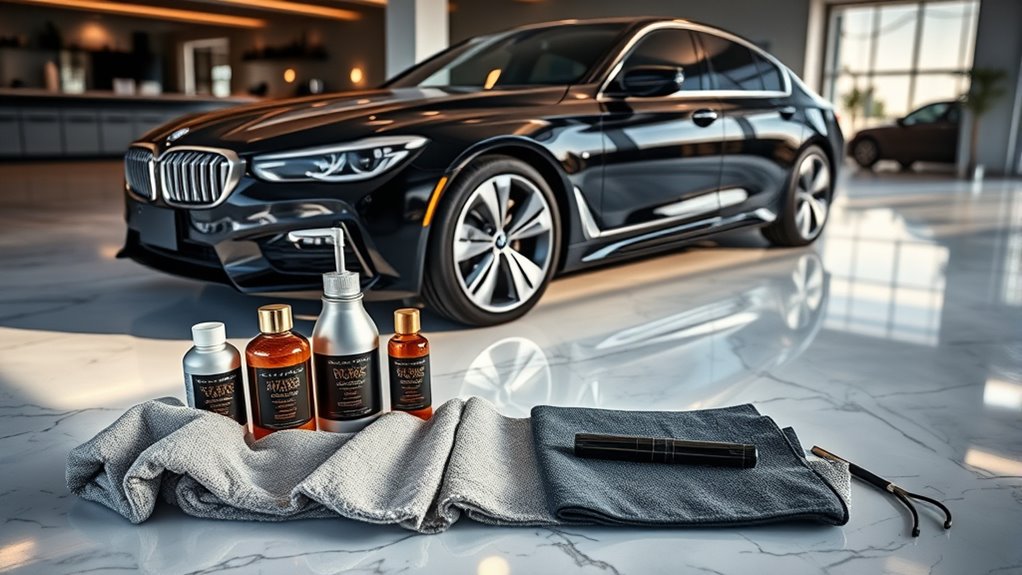 When selecting a luxury car wax or detailing kit, I always consider the quality of ingredients and how easy it is to apply. I also look for products that offer durability and surface compatibility to guarantee long-lasting protection without damage. Protective features like UV resistance and water repellency are equally important for keeping my car looking pristine.