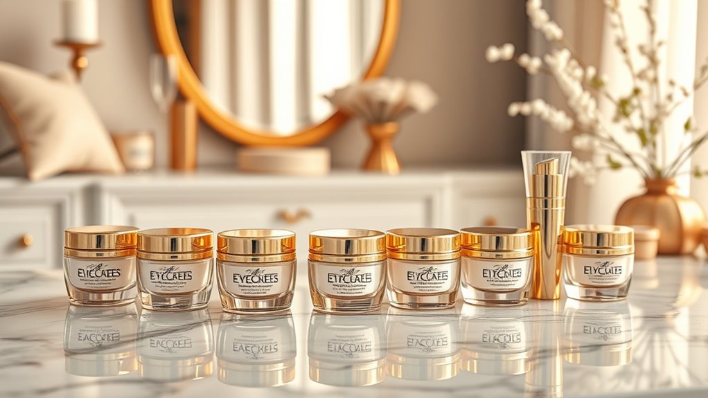 Beyond just addressing dark circles, luxury eye creams often pack a variety of additional skincare benefits that can enhance your overall eye area health. Many formulations contain anti-aging ingredients like peptides, antioxidants, and botanicals that help reduce wrinkles, firm the skin, and boost elasticity. Hydrating components such as hyaluronic acid and ceramides keep the delicate skin plump and moisturized, diminishing fine lines. Brightening agents like vitamin C and niacinamide improve radiance and reduce dullness, making your eyes look more vibrant. Some creams also soothe sensitive skin, reduce puffiness, and strengthen the skin’s barrier, promoting resilience. Considering these extra benefits guarantees you’re not just treating dark circles but supporting the overall health and youthful appearance of your eye area.