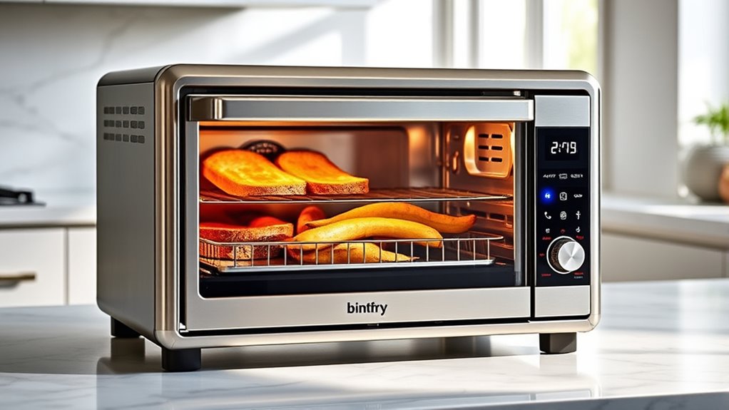 Ever wondered how precise control can elevate your cooking experience with a luxury toaster oven that features air fry? When selecting one, look for models with adjustable temperature controls, timers, and multiple preset functions to tailor each dish perfectly. Digital displays and intuitive interfaces make it easy to navigate settings and monitor progress in real-time, reducing guesswork. A variety of cooking modes—air fry, bake, broil, toast—should have dedicated controls or programmable options for convenience. Flexible temperature ranges, from warm to 450°F or higher, ensure versatility for different foods. User-friendly control panels, including features like toast shade adjustments, auto-shutoff, and precise timing, enhance safety and usability, making your gourmet home cooking effortless and enjoyable.