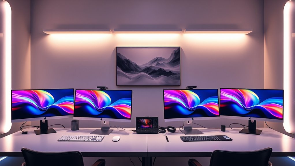 To guarantee my photography workflow runs smoothly, I need a Mac Studio that supports the right display options. I look for models that natively support DisplayPort 1.4 over USB-C or Thunderbolt 4, ensuring high-quality visuals. It’s important to confirm the maximum number of displays I can connect simultaneously—up to three 6K displays at 60Hz, for example. I also check supported resolutions and refresh rates, especially for 4K, 5K, 6K, and 8K monitors, to match my editing needs. Having the right video output ports, like Thunderbolt 4, USB-C, or HDMI, is vital for flexibility. In conclusion, I verify HDR support, such as Dolby Vision and HDR10+, to guarantee accurate color grading in my photography projects.
