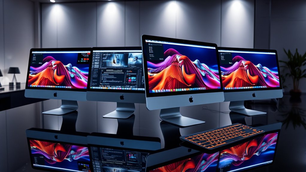 Thermal management in high-memory Mac Studios works quite smoothly, ensuring your powerhouse stays cool under pressure. I’ve noticed the advanced cooling system efficiently dissipates heat through strategic airflow and silent fans, preventing overheating during intensive tasks. This clever design allows the system to perform at its best without breaking a sweat, so you can focus on your work without worry. It’s like having a quiet, efficient guardian keeping everything running efficiently.