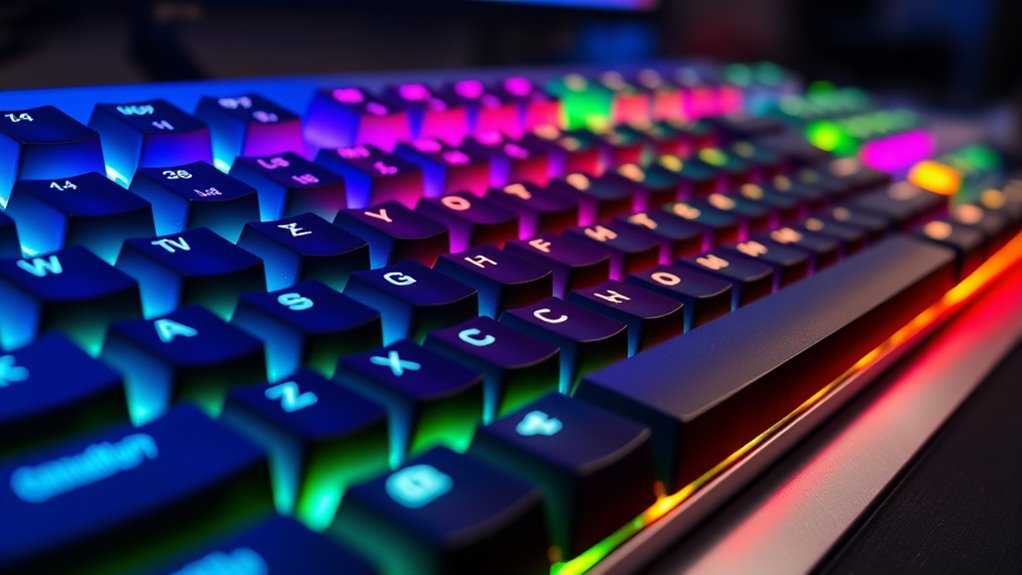 Choosing a mechanical keyboard with strong customization options can considerably enhance your gaming experience. Hot-swappable switches allow me to easily swap out switches without soldering, letting me tailor the feel and sound to my preferences. Programmable keys and macro support enable me to assign complex commands and shortcuts, giving me a competitive edge. Adjustable lighting modes, colors, and effects help me create a personalized aesthetic that matches my setup or mood. Some keyboards offer software or firmware for detailed remapping and multiple profiles, making switching between games seamless. Hardware features like adjustable actuation points and customizable keycaps further expand my tactile and visual personalization options. These customization features guarantee my keyboard adapts perfectly to my gaming style and preferences.